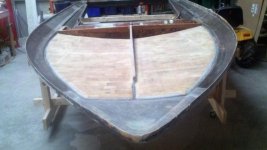 heres the repaired damage to the bow from the bottom, 2 layers 17 oz bi-axle, 1 layer 1708......time to flip this old girl.....